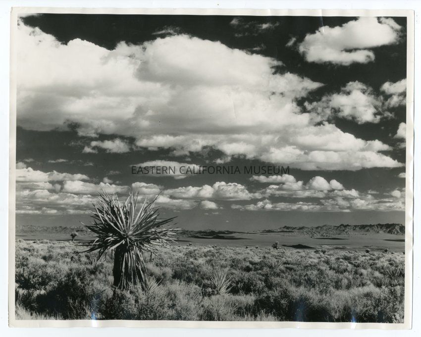 Label on reverse: Yucca mohavensis, view across Mojave desert near Providence Mountains.