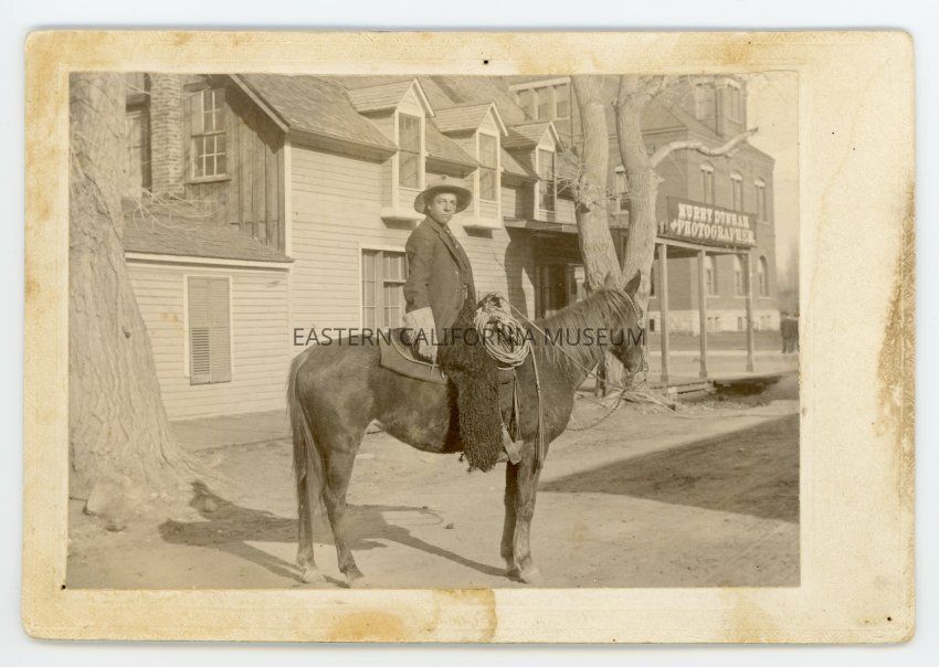 Mounted photograph of an unidentified man wearing chaps, spurs, and fringed gloves on horseback in front of a large, fine structure with a sign that says, "Murry Dunham Photographer." The photo has three pinholes poked through it and some areas of brown discoloration.