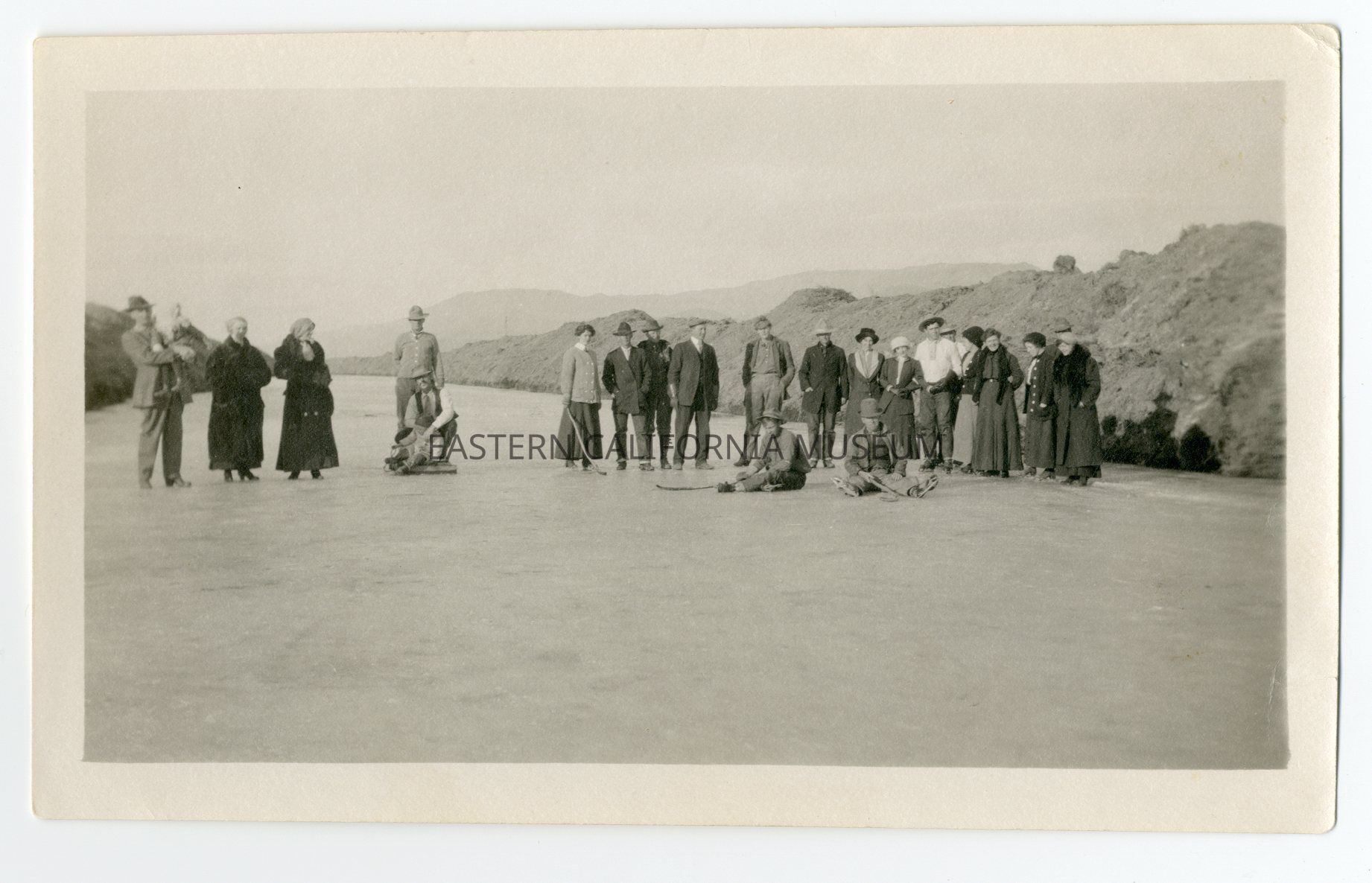 Photo of a large group of 24 people (including two children) standing on the frozen aqueduct. Three people have long sticks--perhaps they were playing hockey?