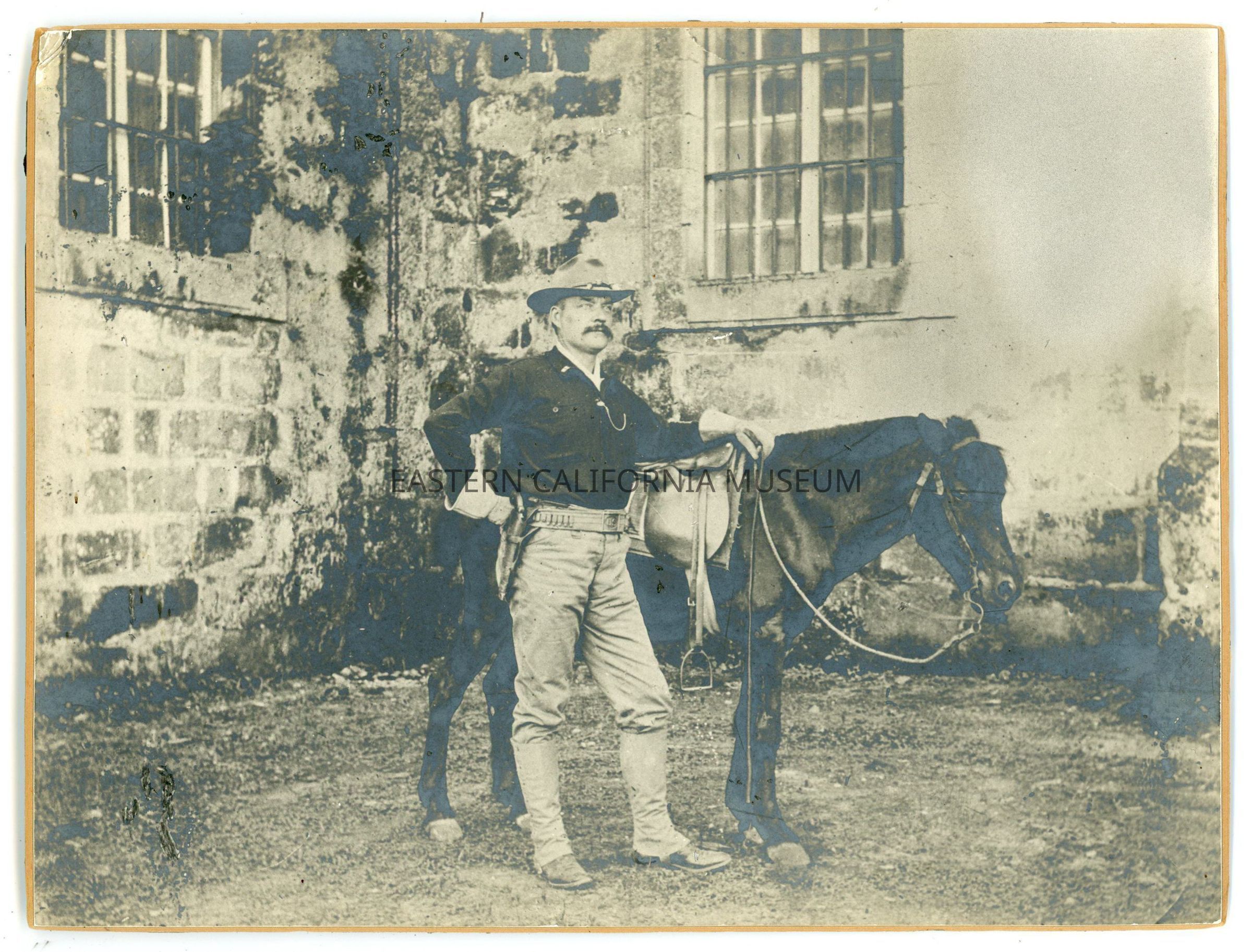 Mounted photo of Captain S. R. Langworthy standing beside a small horse or pony. There is a tall building with bars on the windows behind him.
