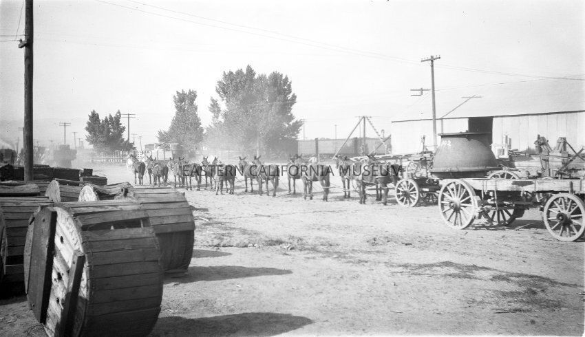 B & W digital scan of LADWP laborer preparing mule team for hauling machinery on LA Aqueduct Project. Location, given boxcars in the background and warehouse, may be a railhead, perhaps Mojave or Cinco, railhead for the Jawbone Division of the Aqueduct Project.