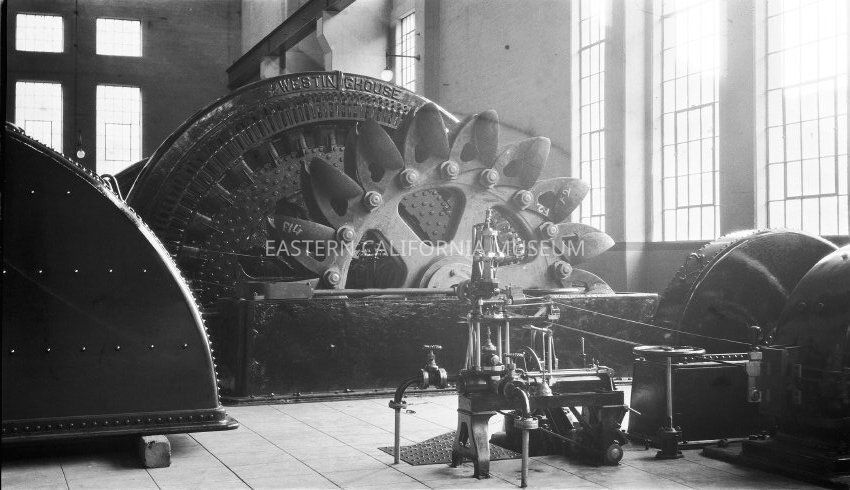 B & W digital scan of interior of San Francisquito Power Plant #1 showing Pelton Wheel and Westinghouse Generator producing hydroelectric power on the LA Aqueduct system.