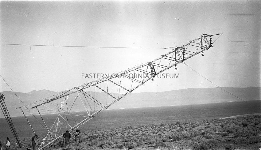 B & W digital scan of LADWP laborers erecting transmission tower, west of Owens Lake and possibly south of Cottonwood Power Plant. The purpose of this project may be the distribution of power south necessary for the construction of the LA Aqueduct and running the city's Monolith and Haiwee Cement Plants. Note Owens Lake filled with water in the background.