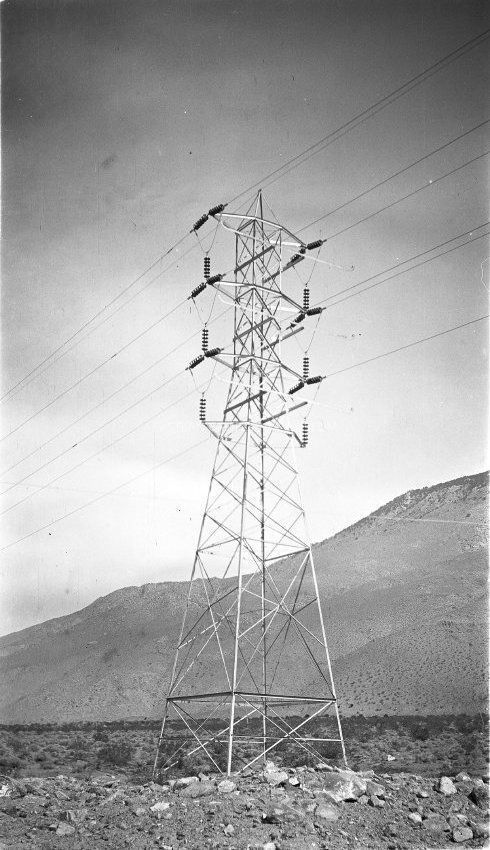 B & W digital scan of LADWP transmission tower erected by Bureau of Aqueduct Power. In 1909 the Bureau of Los Angeles Aqueduct Power is created to build hydro power plants along the Los Angeles Aqueduct. Ezra F. Scattergood is selected as the Bureau’s first chief electrical engineer. Once the Aqueduct is completed in 1913, the generation and distribution of municipal power (carried by towers such as this one) to Los Angeles becomes a reality.