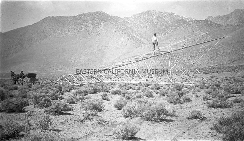 B & W digital scan of man (possibly LADWP laborer) on top of transmission tower, part of distribution line to be built sending power generated from plants along the LA Aqueduct south to Los Angeles. Location Mojave Desert, Southern Sierra. Note mules and buggy.