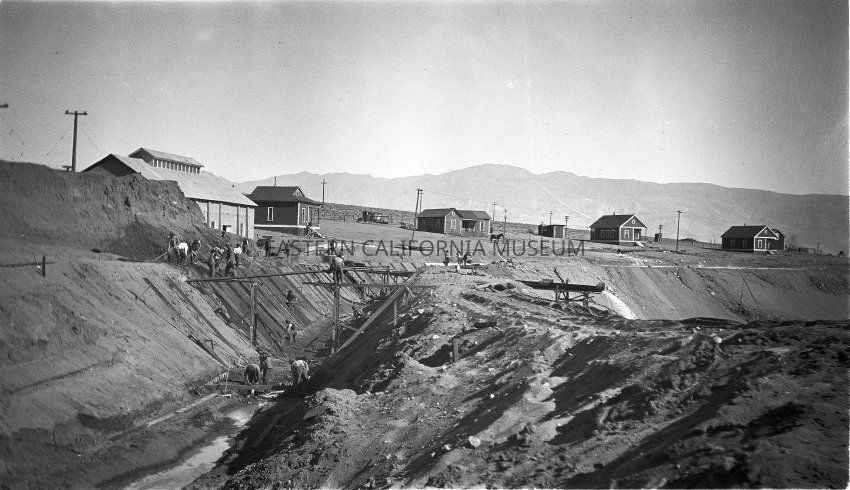 B & W digital scan of LA Aqueduct lining crew working on open, lined canal section of LA Aqueduct, Cottonwood Power Plant region. Laborers visible grading slopes of canal, placing forms and finishing concrete in the distance. Cottonwood Power Plant on left of image; other structures to the right are employee housing.