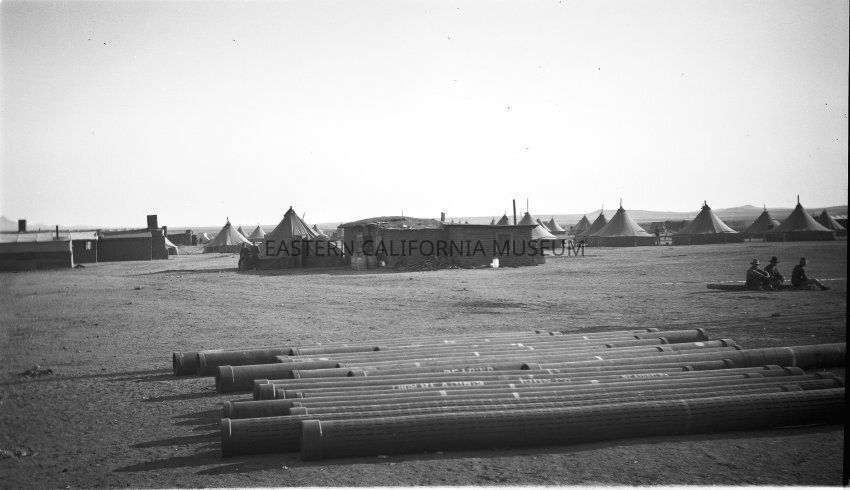 B & W digital scan of LA Aqueduct construction camp, location unknown (possibly Mojave Desert). Tents housing laborers have vent pipes protruding from tents for heating. The style of tents comprising camp different from the typical rectangular, tent cabins.