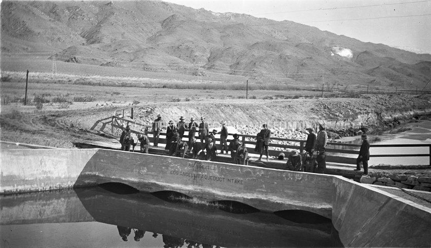 B & W digital scan of LA Aqueduct engineers, city officials and other dignitaries assembled at the the Aqueduct Intake to christen its opening. Looking from upstream side of Intake south to the Inyo Mountains.