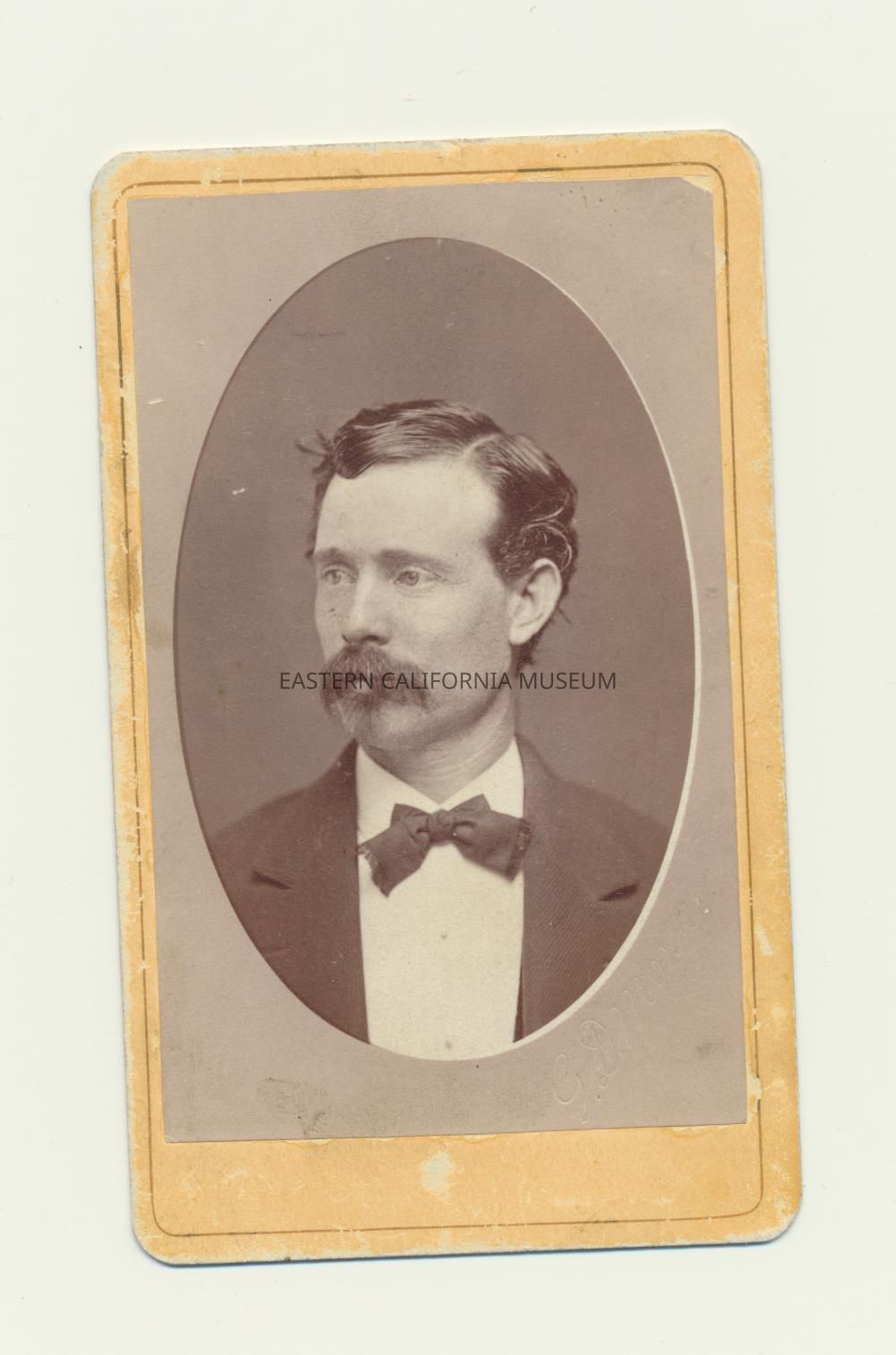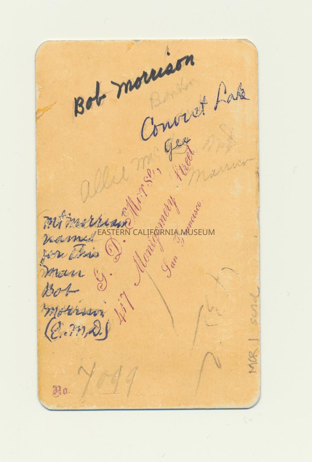 Small mounted studio portrait of a man identified as Robert "Bob" Morrison, a Benton merchant. He is the man for whom Mt. Morrison near Convict Lake is named. He was killed on 09/23/1871 while he was acting as member of a posse pursuing escaped convicts from the Nevada State Penitentiary. The photographer was G. D. Morse of San Francisco and the photo was given his ID #7099. The photographer's name is impressed on the photo itself in lower right corner, as well as being printed on the reverse in a reddish ink.