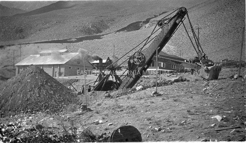 B & W digital scan of LADWP Steam Shovel (with only boon and bucket visible) excavating channel for open, lined section of Los Angeles Aqueduct, Cottonwood Canyon. Cottonwood Power Plant visible just to left of steam shovel.