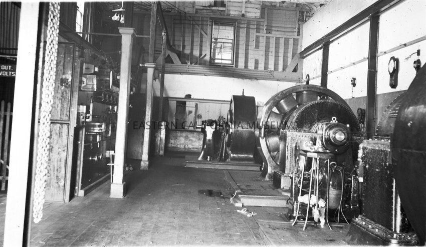 B & W digital scan of interior of Cottonwood Power Plant, supplying power to electric shovels and dredges for constructing LA Aqueduct. Control panel to left of image.