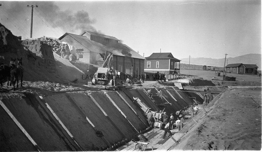 B & W digital scan of LA Aqueduct lining crew at work on section of open canal adjacent to Cottonwood Power Plant. It shows the machinery and equipment used to line the aqueduct. Note cement cart being filled at trough and the water wagon visible near center.