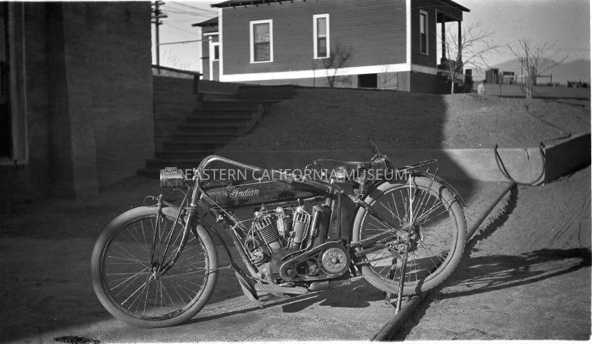 B & W digital scan of an Indian Motorcycle parked in front of Cottonwood Power Plant. Employee residence in background. Motorcycle may belong to Edward Leahy.