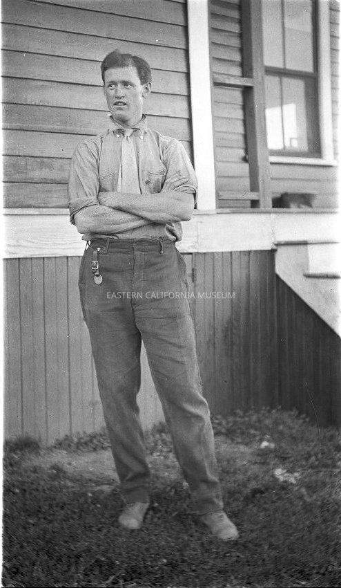 B & W digital scan of Edward Leahy, DWP employee, standing with his arms crossed in front of DWP residence at the Cottonwood Power Plant.