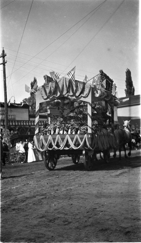 B & W digital scan of a horse-drawn float in Harvest Festival parade on Main Street, Bishop. Float is adorned with ornamental baskets, flags, bunting, and vegetables. The building in the background is a grocery store.