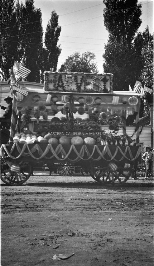 B & W digital scan of a horse-drawn float in Harvest Festival parade on Main Street, Bishop. Fruit and flowers may have been used to form the word "HARVEST." There are many baskets hanging and displayed on the wagon, vegetables, flags, and bunting.