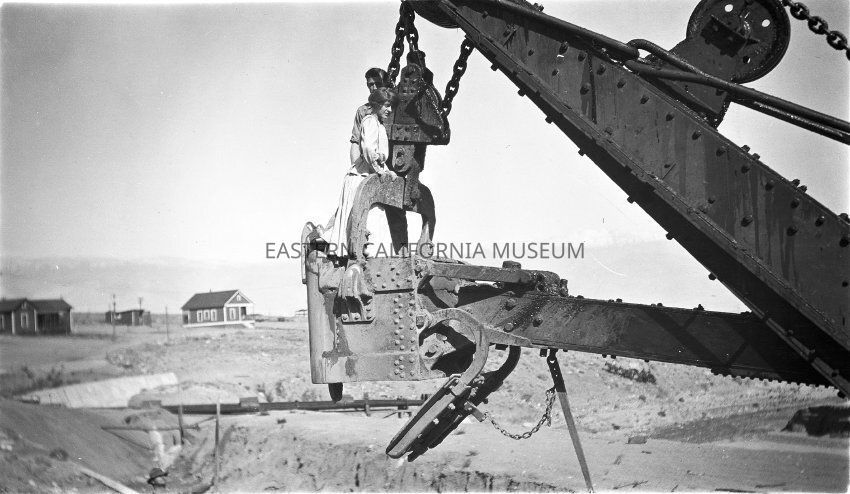 B & W digital scan of Edward Leahy and unidentified female (wife?) in the bucket of aqueduct steam shovel, Cottonwood Power Plant. Shovel is suspended above excavated channel destined to become the open, lined section of LA Aqueduct. LADWP Employee Housing area in background.