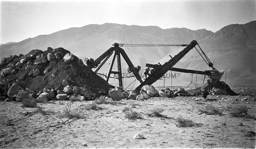 B & W digital scan of an LA Aqueduct steam shovel excavating a ditch for open, lined section of aqueduct. Location is the Cottonwood/Olancha area. Note the size of boulders being excavated compared to the size of the man standing on shovel boom possibly repairing shovel.