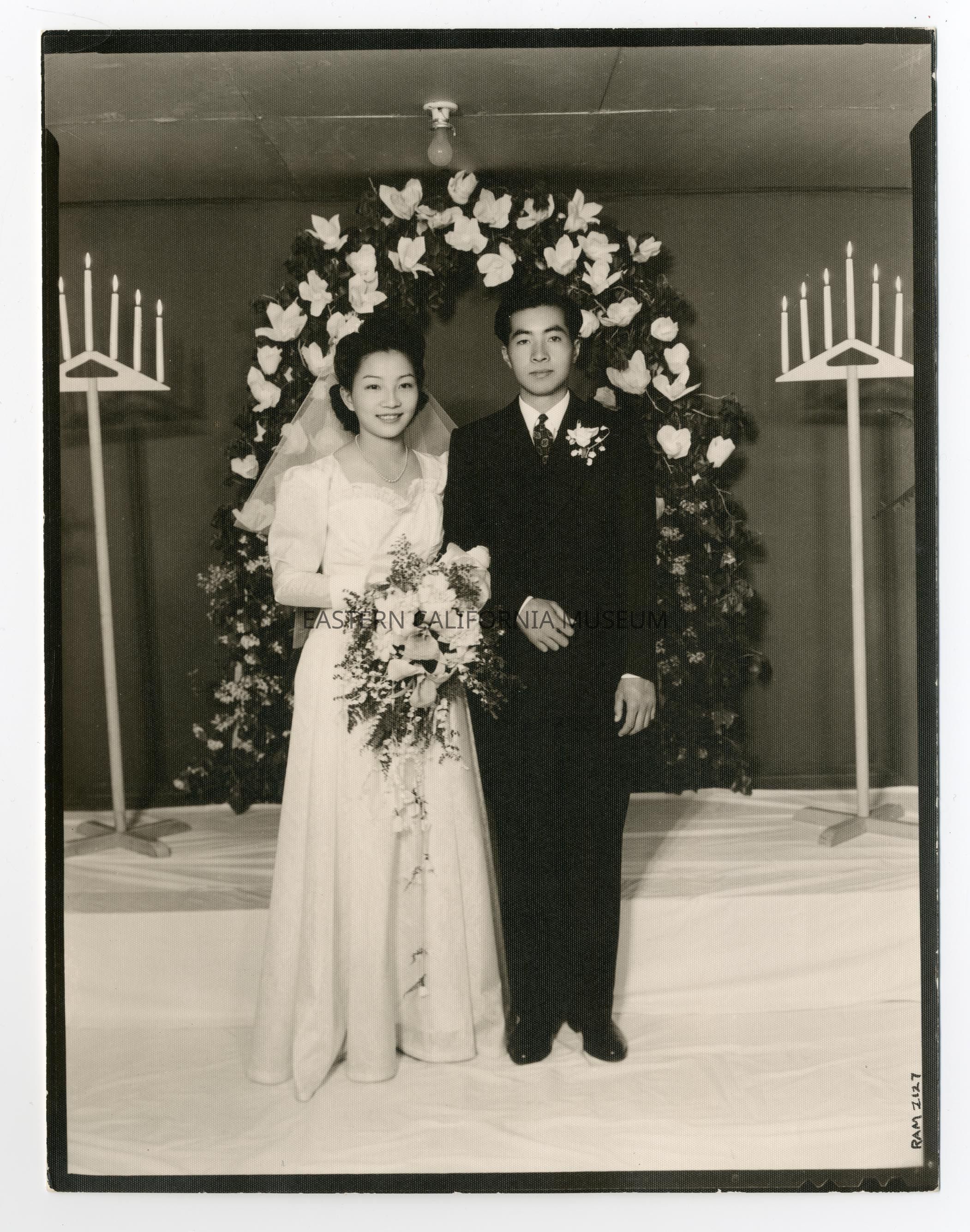 Interior photograph of man wearing a suit and a woman wearing wedding dress standing in front of large floral wreath arrangement with floor stand candle holders on each side. They are Yuichi Hirata and Fumi Shimizu Hirata.Photograph Details