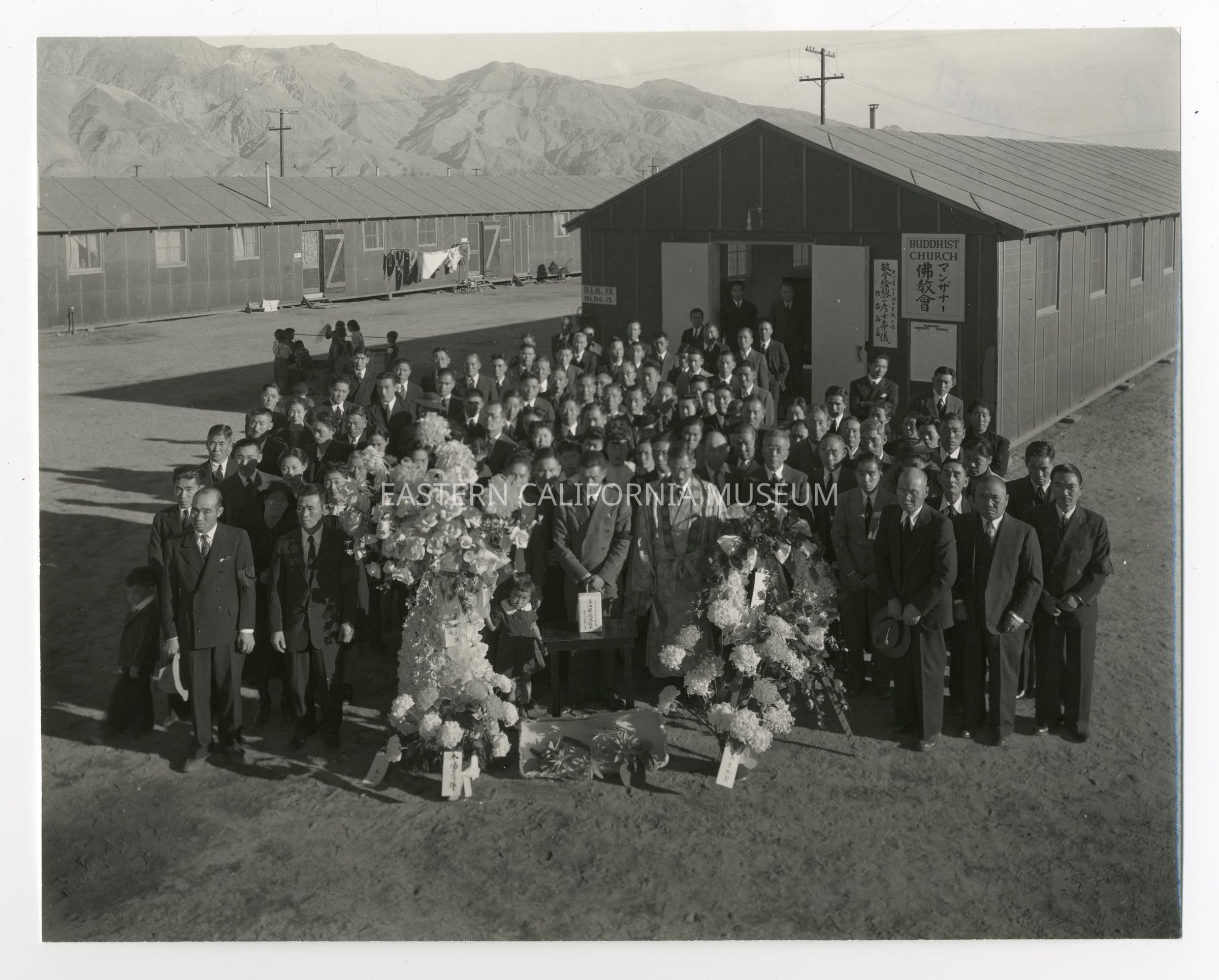 Exterior funeral scene in front of the Buddhist Church at Manzanar War Relocation Center.