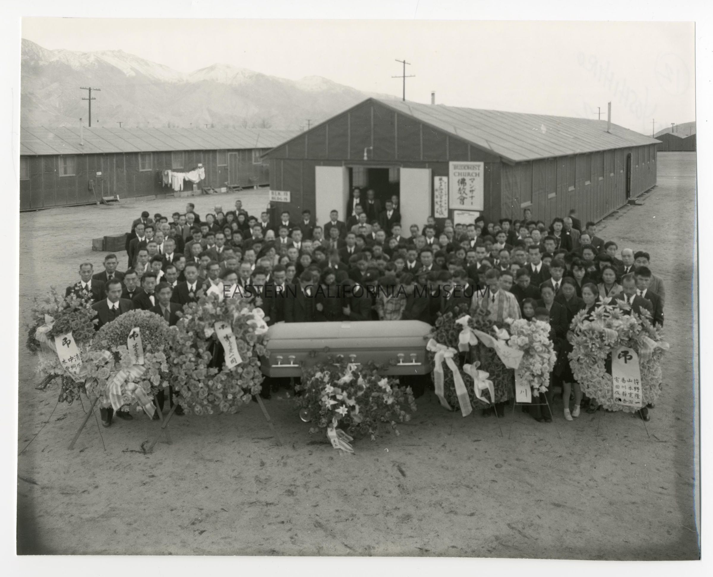 Exterior funeral scene in front of the Buddhist Church at Manzanar War Relocation Center.