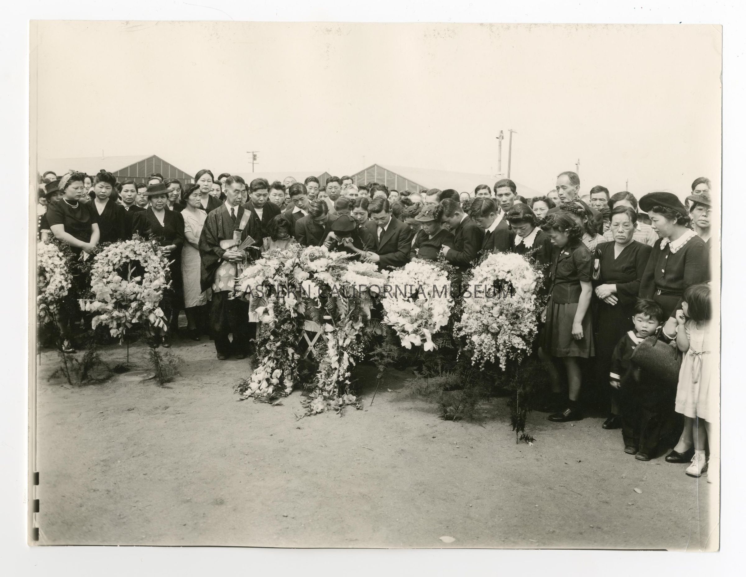 Exterior funeral scene at Manzanar War Relocation Center.Photograph Details