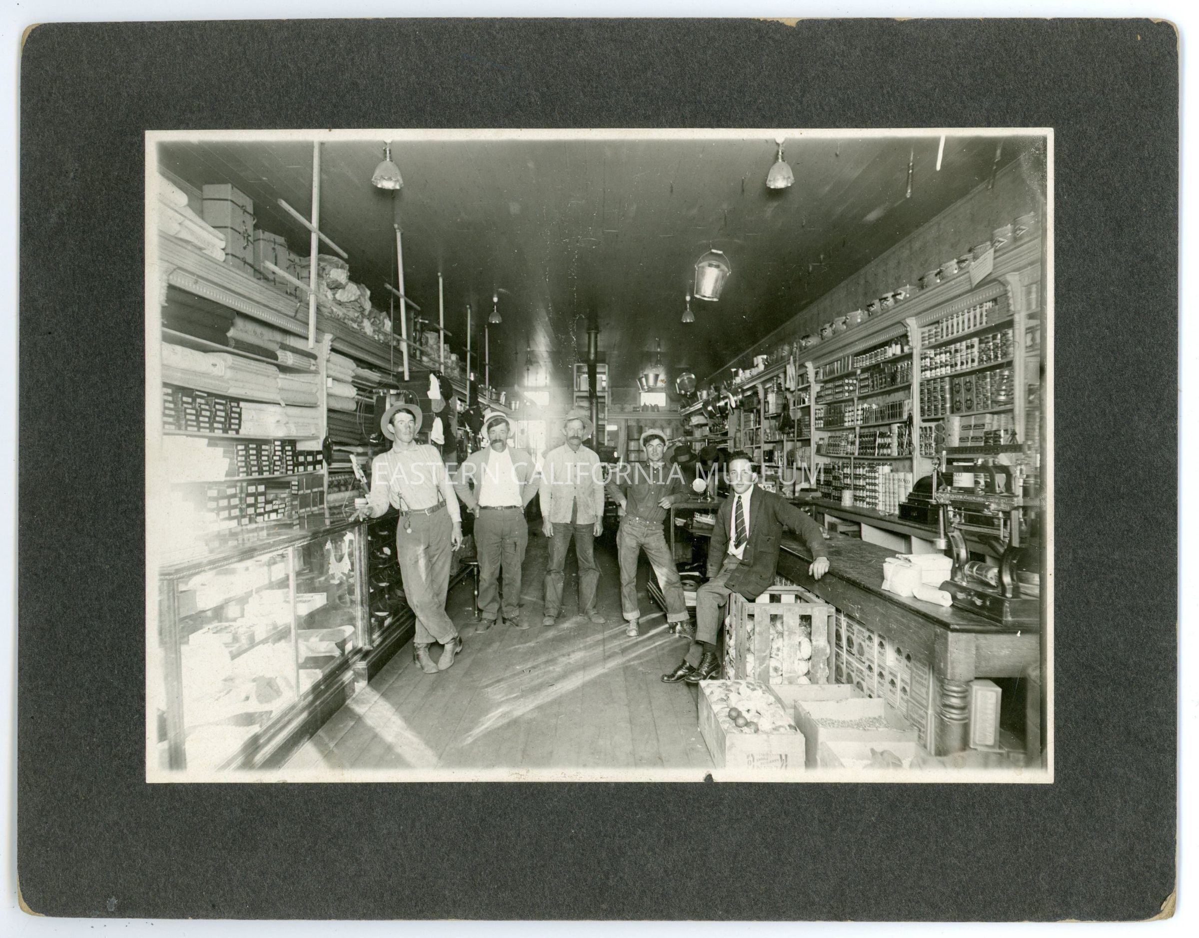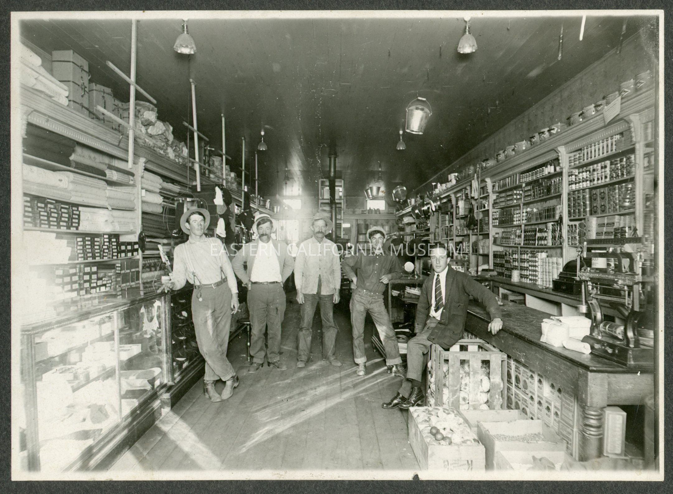 Photo of five men standing inside of a store. There is a stovepipe in the background, tinned or canned foods, bolts of fabric, and much more on display.