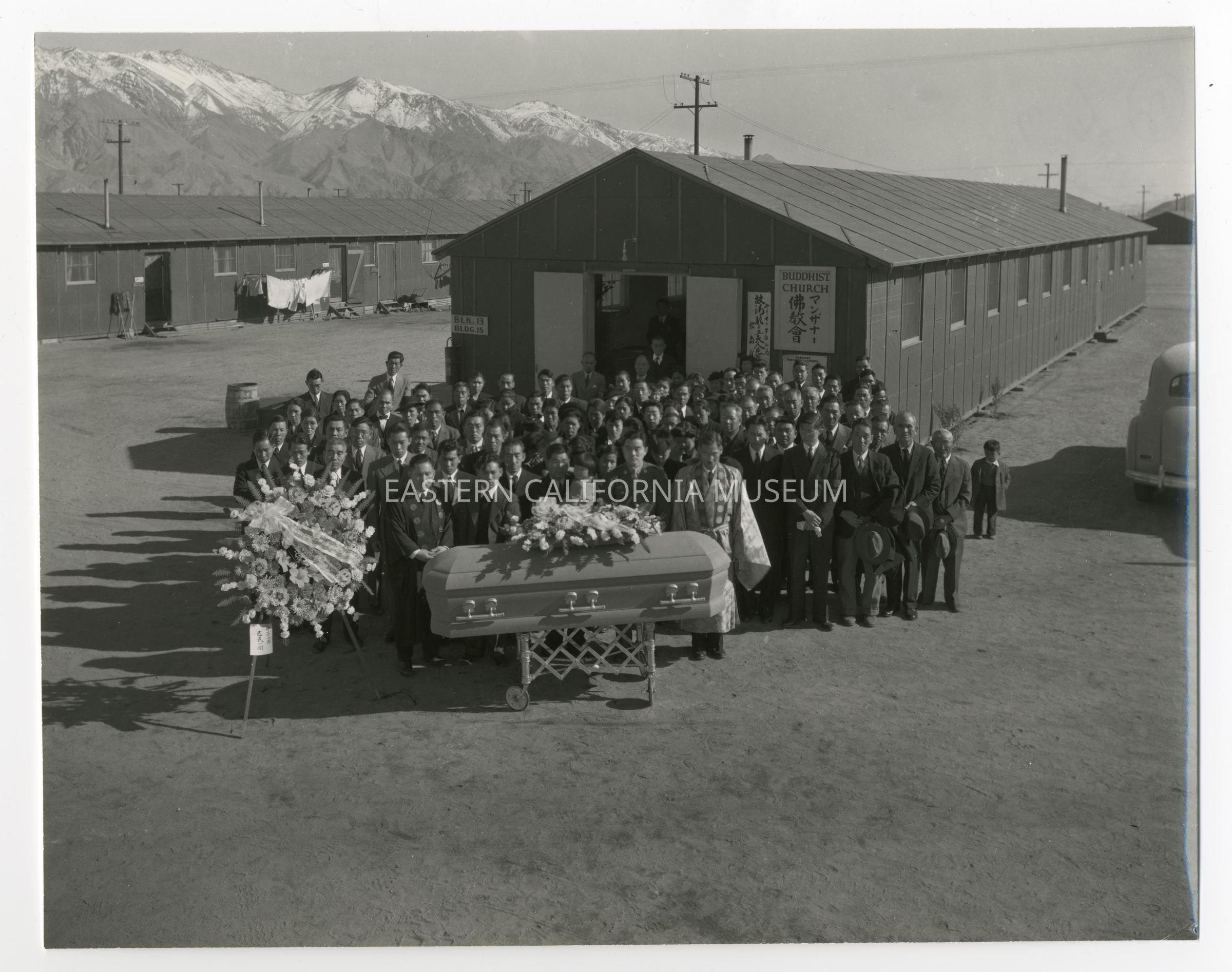 Exterior funeral scene in front of the Buddhist Church at Manzanar War Relocation Center.