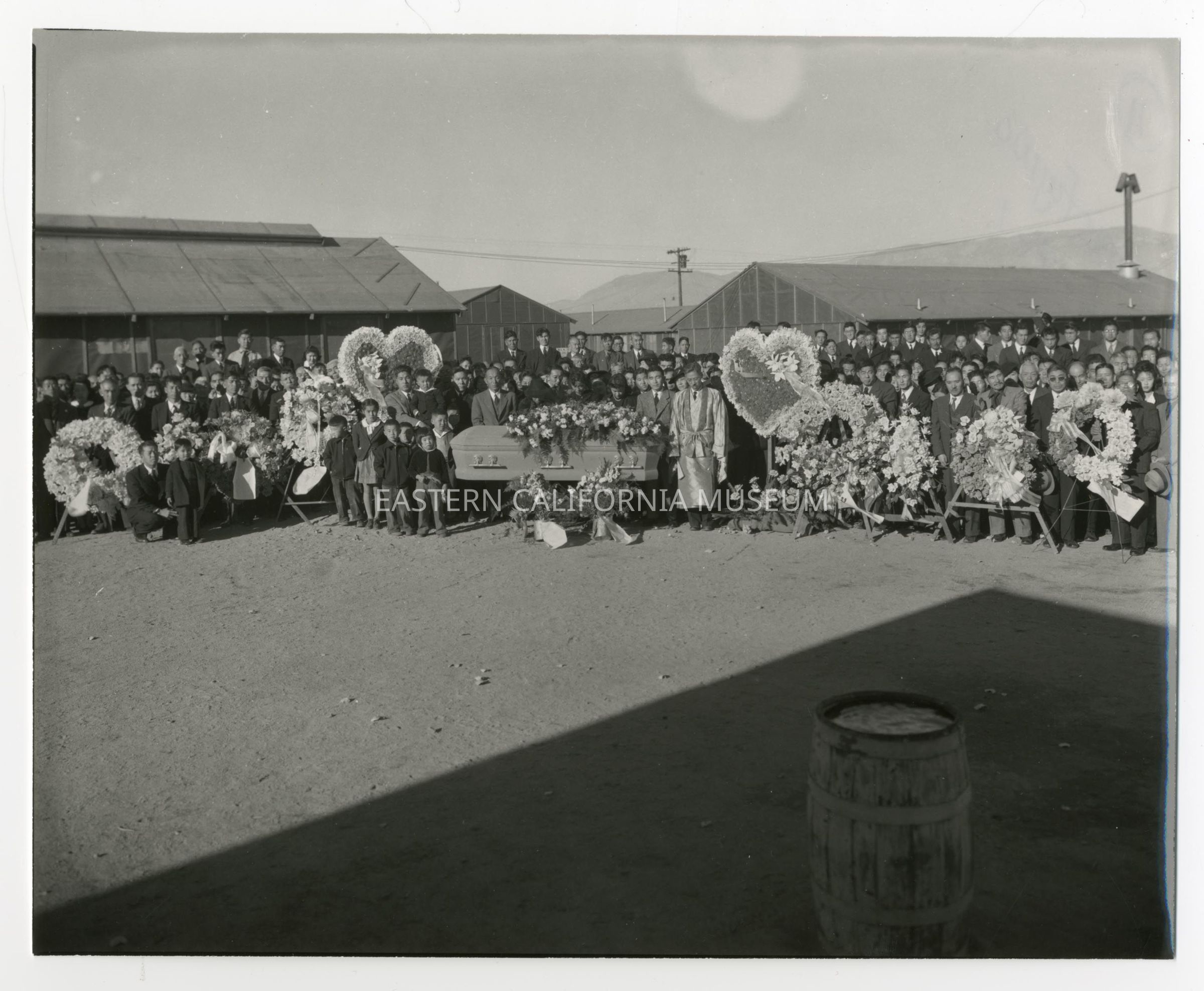 Exterior funeral scene at Manzanar War Relocation Center.