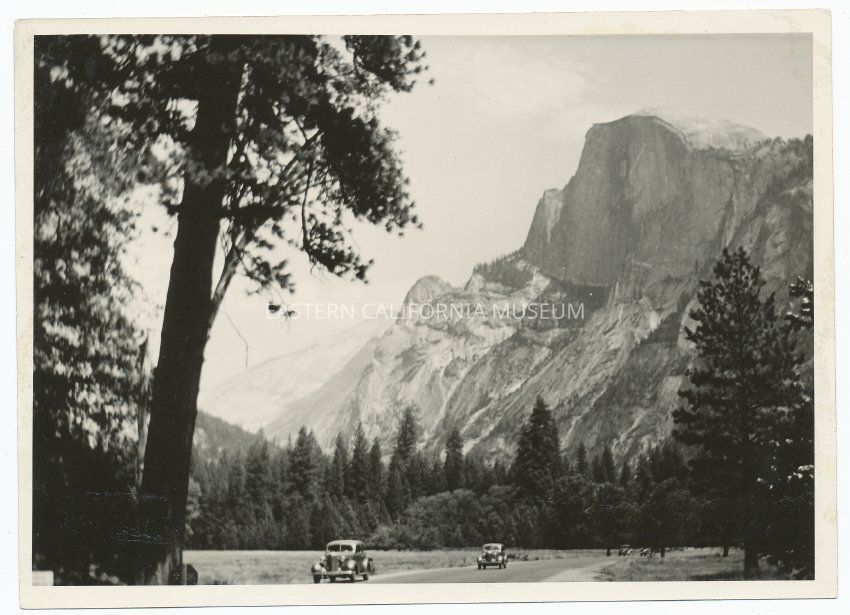 Photo of Yosemite Valley, Half Dome, and vehicles.