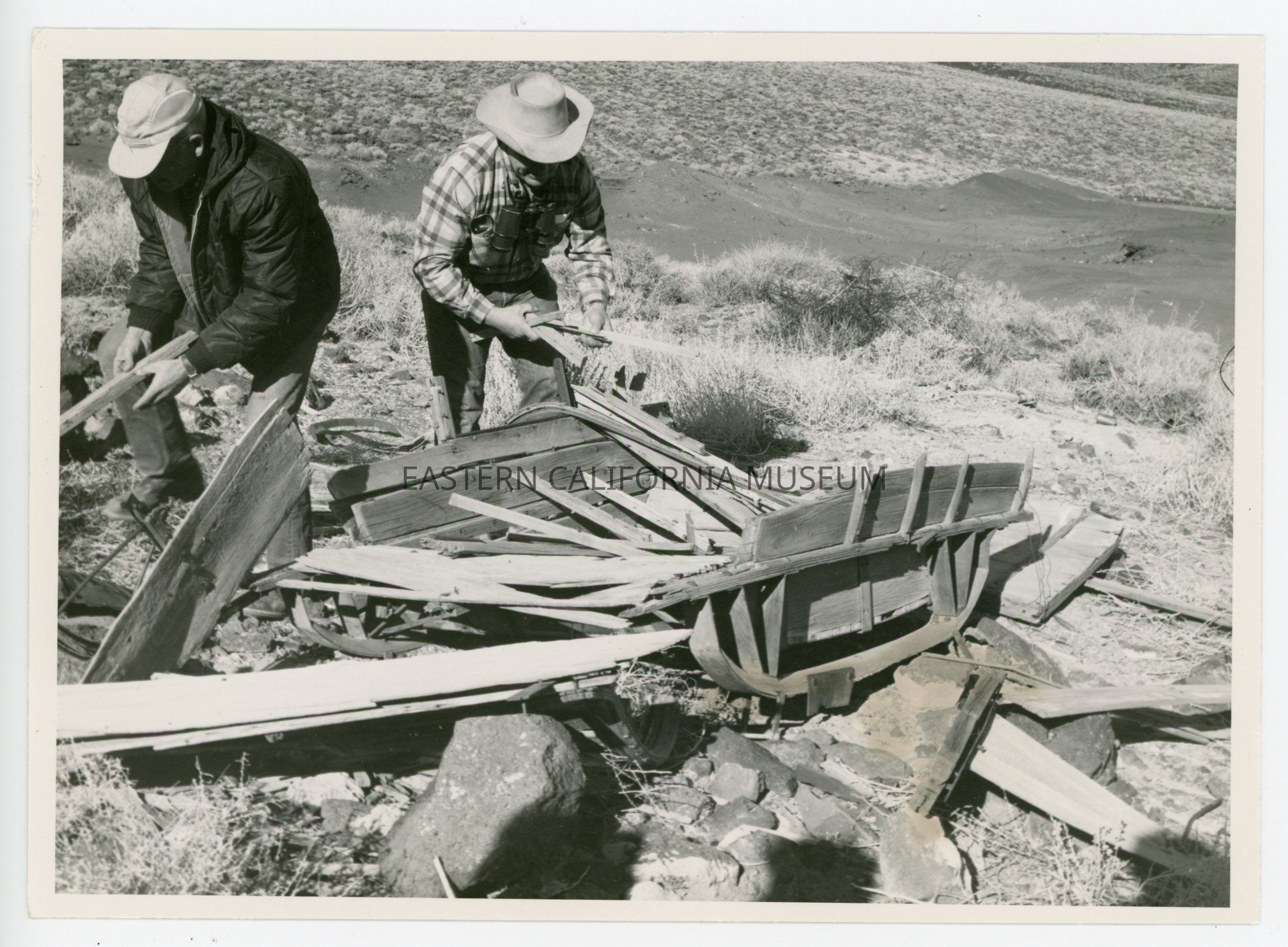 Photo of two men handling the remains of what may be a sled or wagon or stagecoach at Candelaria in December 1963.