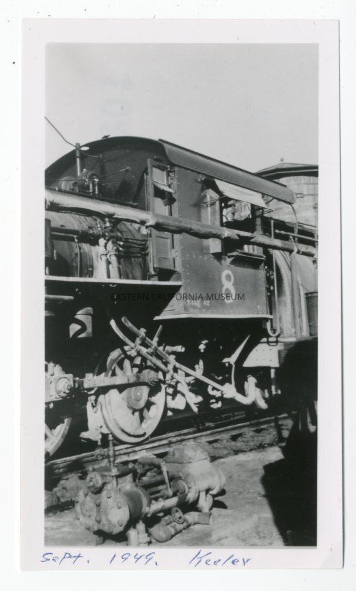 Photo of the cab of Southern Pacific engine #8. There appears to be a water tower in the background and some kind of machinery in the foreground. It is labeled on the front in blue ink "Sept. 1949 Keeler."
