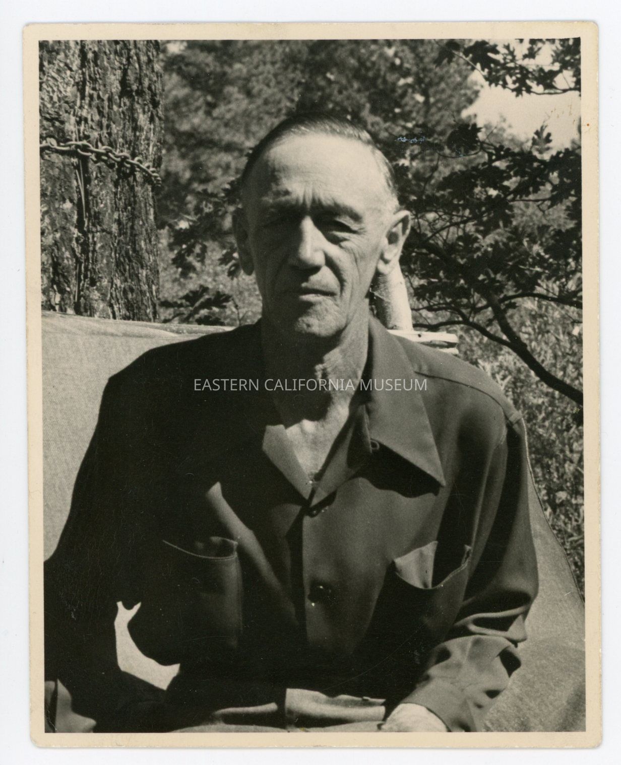 Photo of an older man sitting outside. The tree behind him to the left side has a metal chain around it.