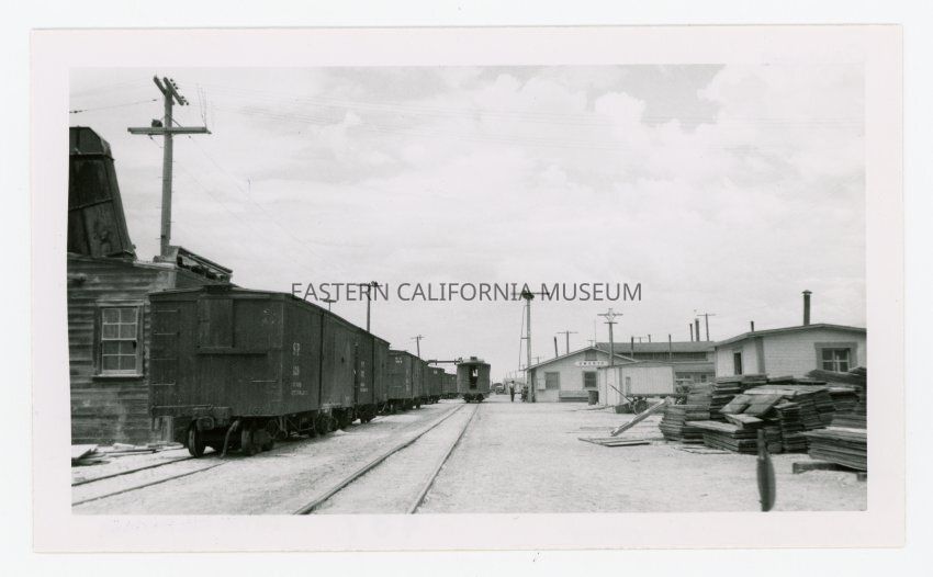Photo of the trainyard at Owenyo. Shows Southern Pacific boxcars, the Owenyo station, lumber, buildings, and tracks.