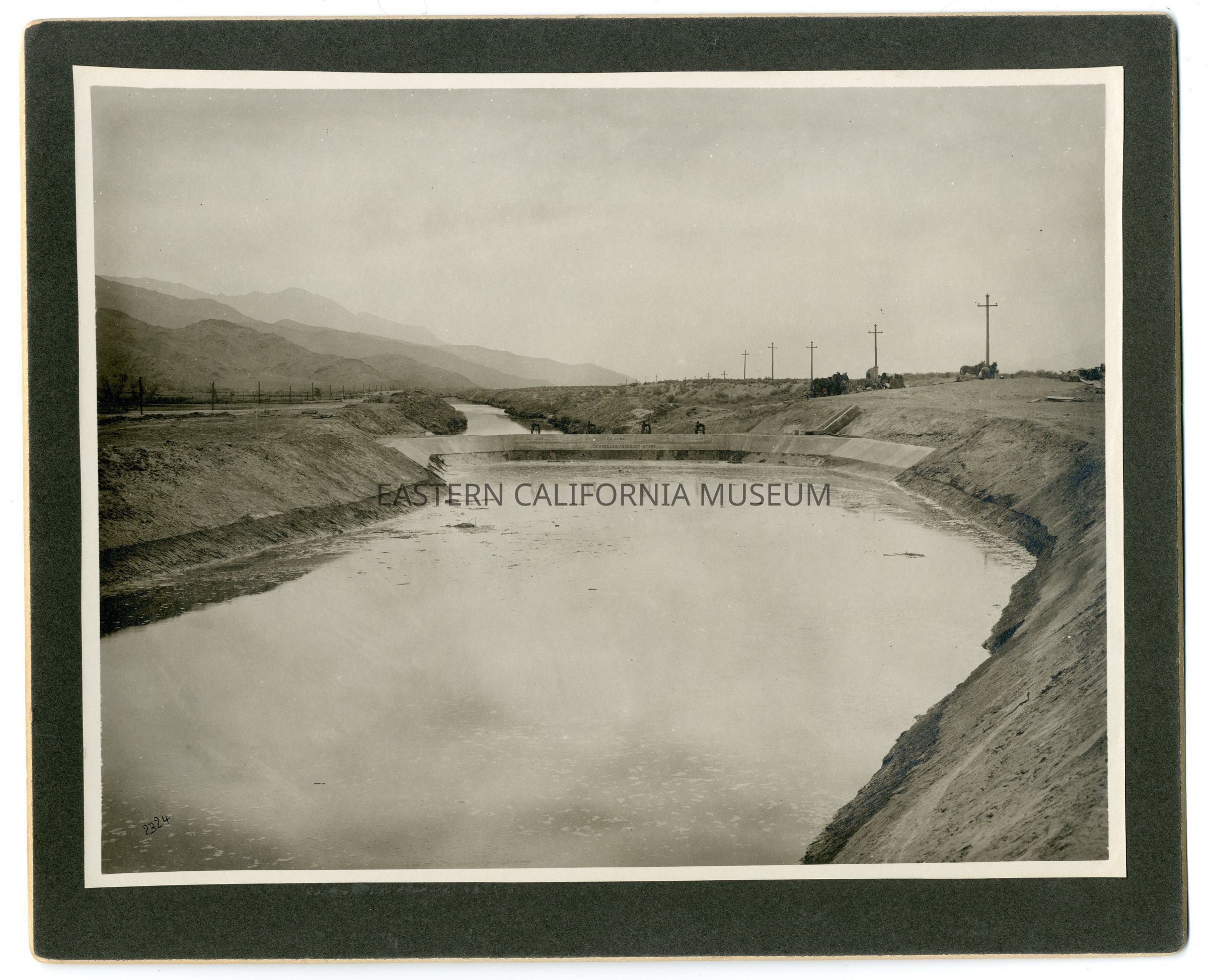 Mounted photo of the Los Angeles Aqueduct Intake seen from north side (front) of structure. The four control gates are closed forcing the water level near the top of the structure, making it appear to be a low dam. The open, unlined section of the L.A. Aqueduct is visible on the other side of Intake as well as the transmission lines conveying power to run the electric dredges which operated on that section. Horses, wagons, machinery, and two laborers are visible in upper right. The inscription stamped into the concrete is visible: AD MCMXI [1911] Los Angeles Aqueduct. The photo ID number in the lower left corner is 2324.