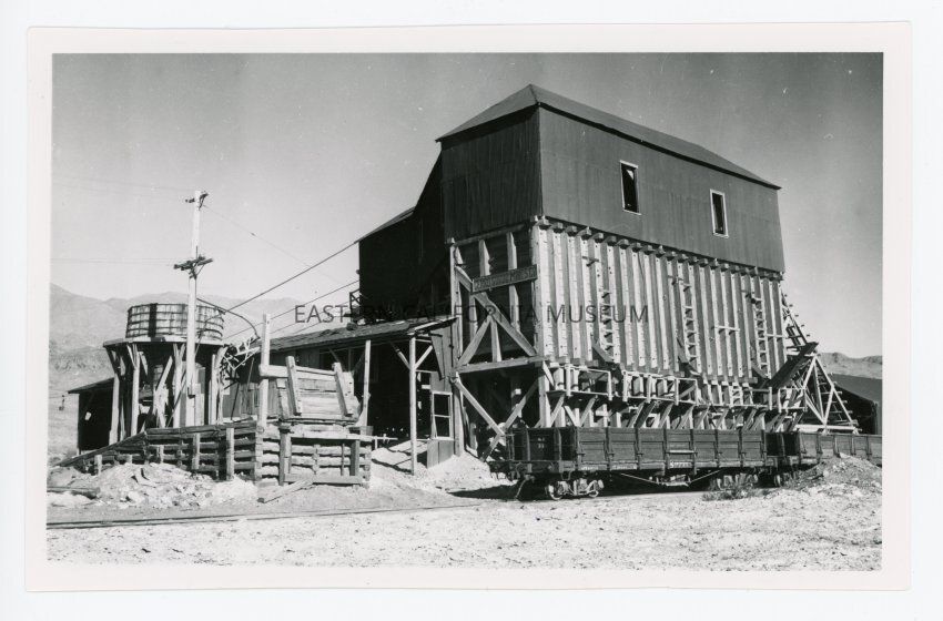 Photo of the Cerro Gordo Tramway Station at Keeler. Southern Pacific car #333 is parked in front of it on the railroad tracks.Collection