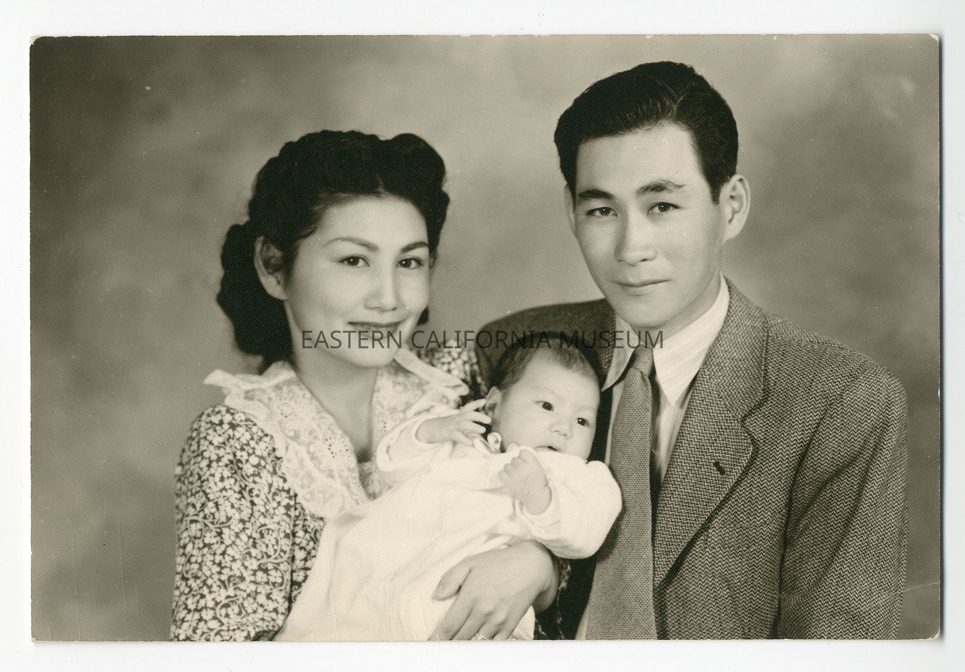 Professional portrait of a young couple holding an infant. They may be Japanese-Americans because this donation also included a document relating to marriages performed at Manzanar in the Spring of 1942 by Rev. Harold Preston.Collection