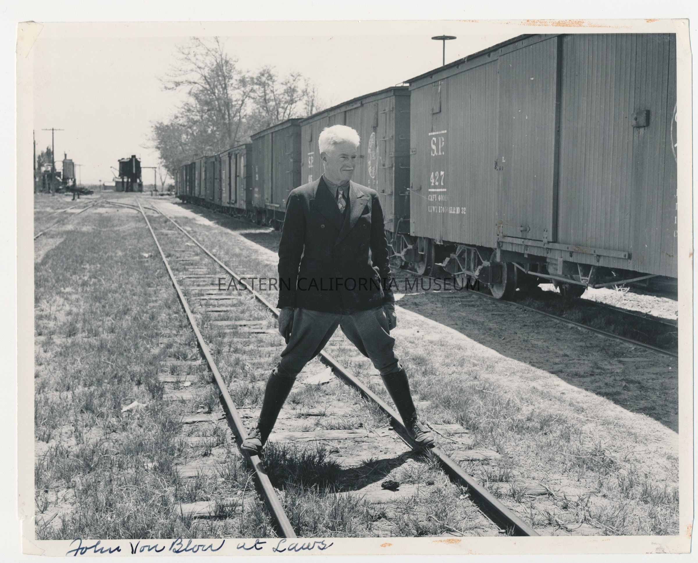 Photograph of a man identified as John von Blow straddling railroad tracks at Laws. There are Southern Pacific boxcars and a water tank in the background.