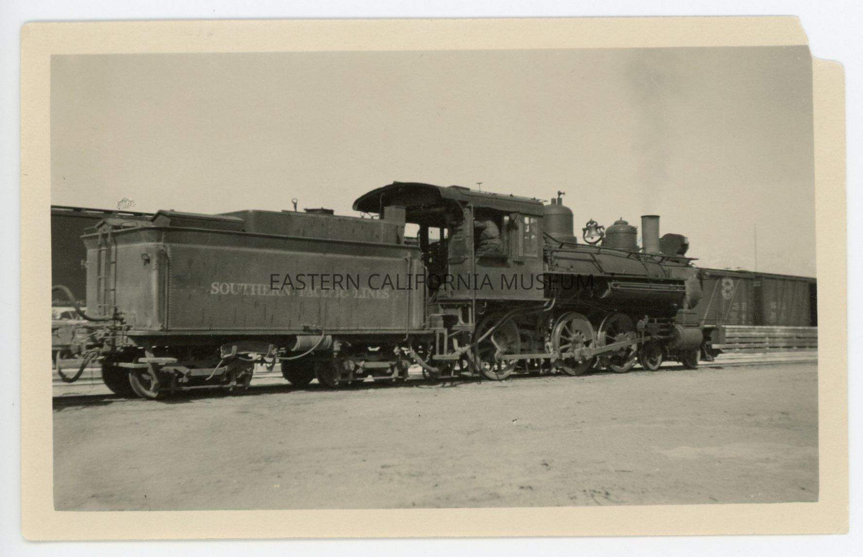 Photo of a Southern Pacific Lines locomotive and tender car. There are boxcars in the background.