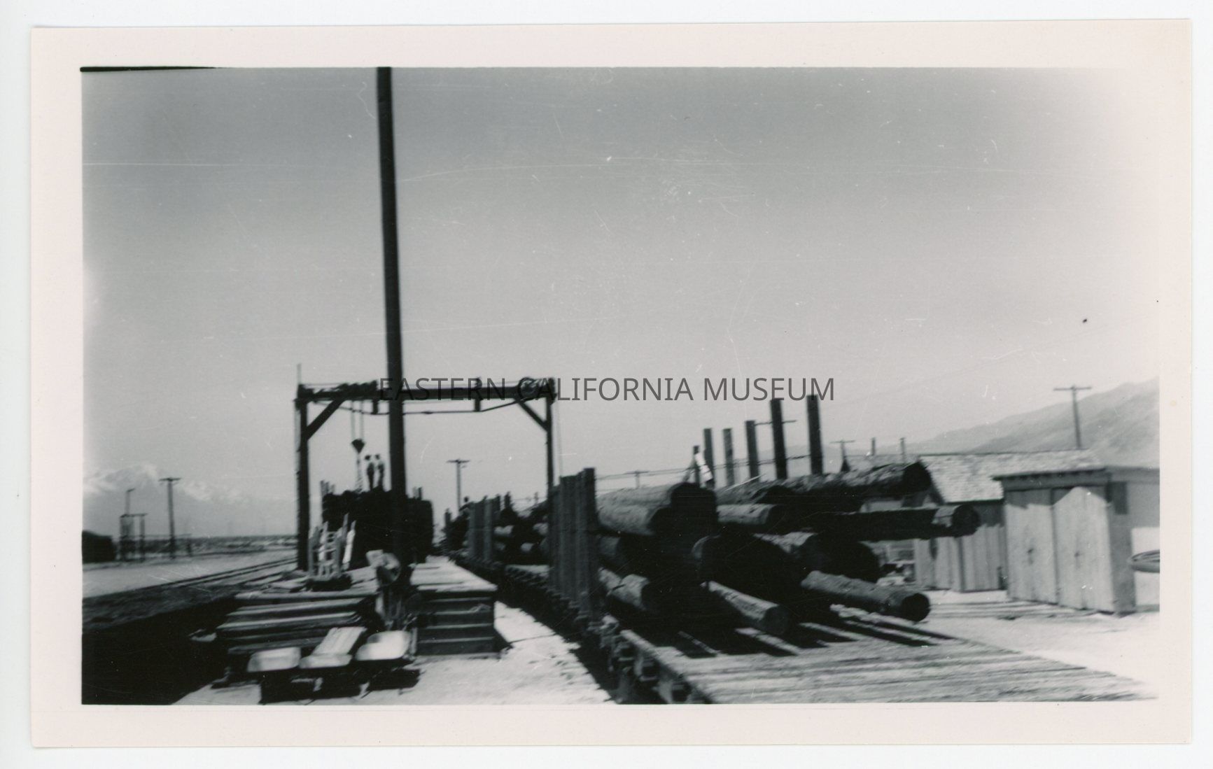 Photo of flat cars with long (power?) poles and the gantry crane at Owenyo. Written in black ink on reverse: Gantry crane, Oweny, 1950.