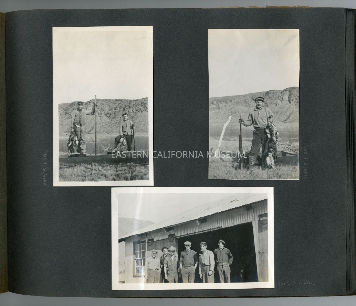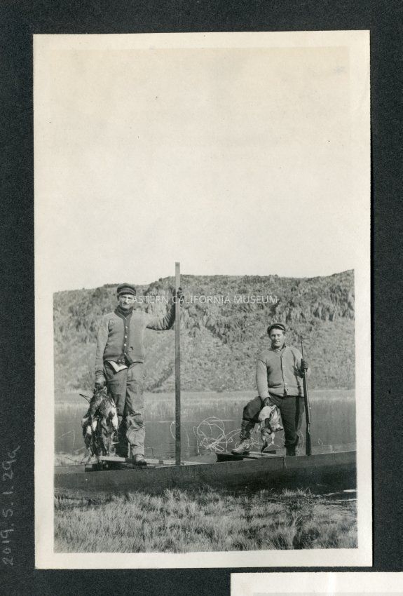 Photo of two men holding ducks or birds they hunted. One man is holding a gun and they are standing on a shallow boat or skiff. There is water and a hill behind them, maybe Little Lake?