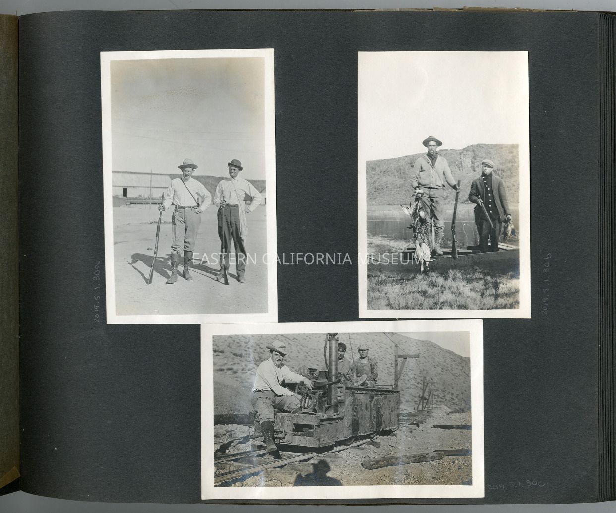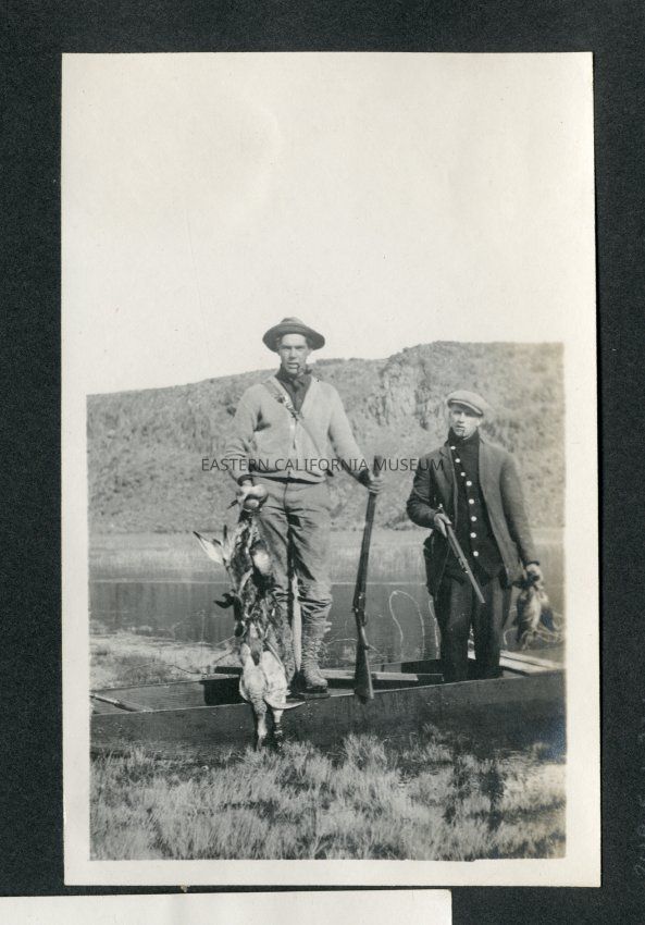 Photo of two men holding ducks or birds they hunted and their guns. They are standing on a shallow boat or skiff. There is water and a hill behind them, maybe Little Lake?