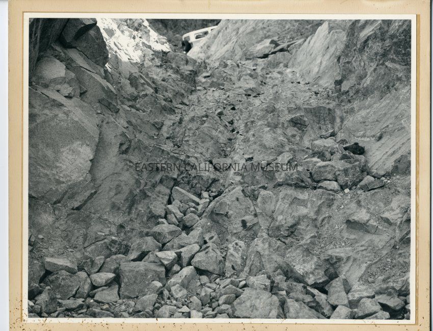 Mounted photograph of rocks in a canyon and a jeep partially visible at top.