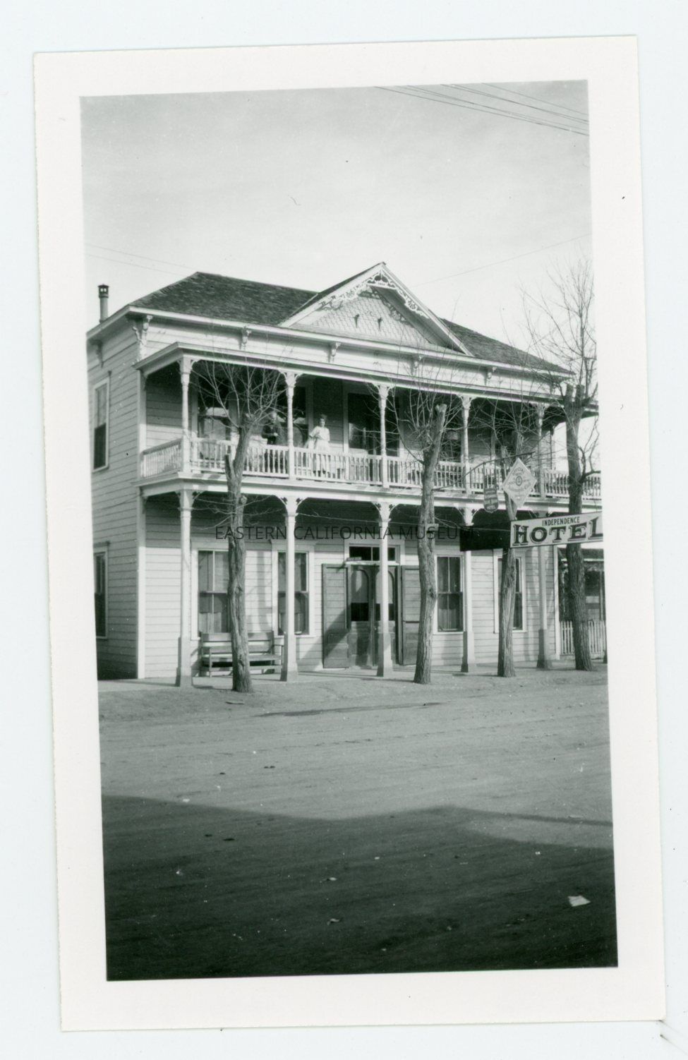 Copy of a photo of the Independence Hotel. There is a woman standing on the second story porch.