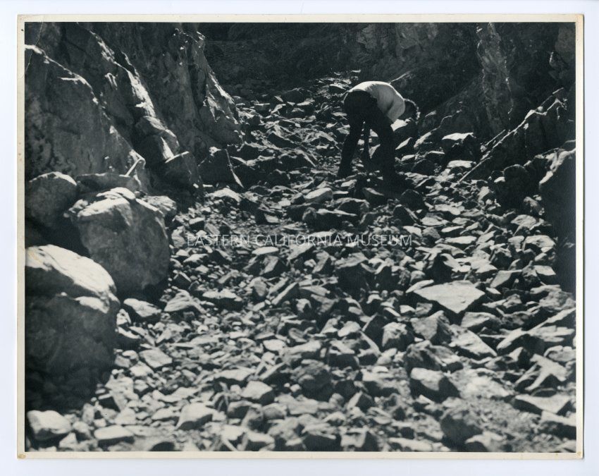 Photo of a man bending over in a rocky canyon examining rocks.