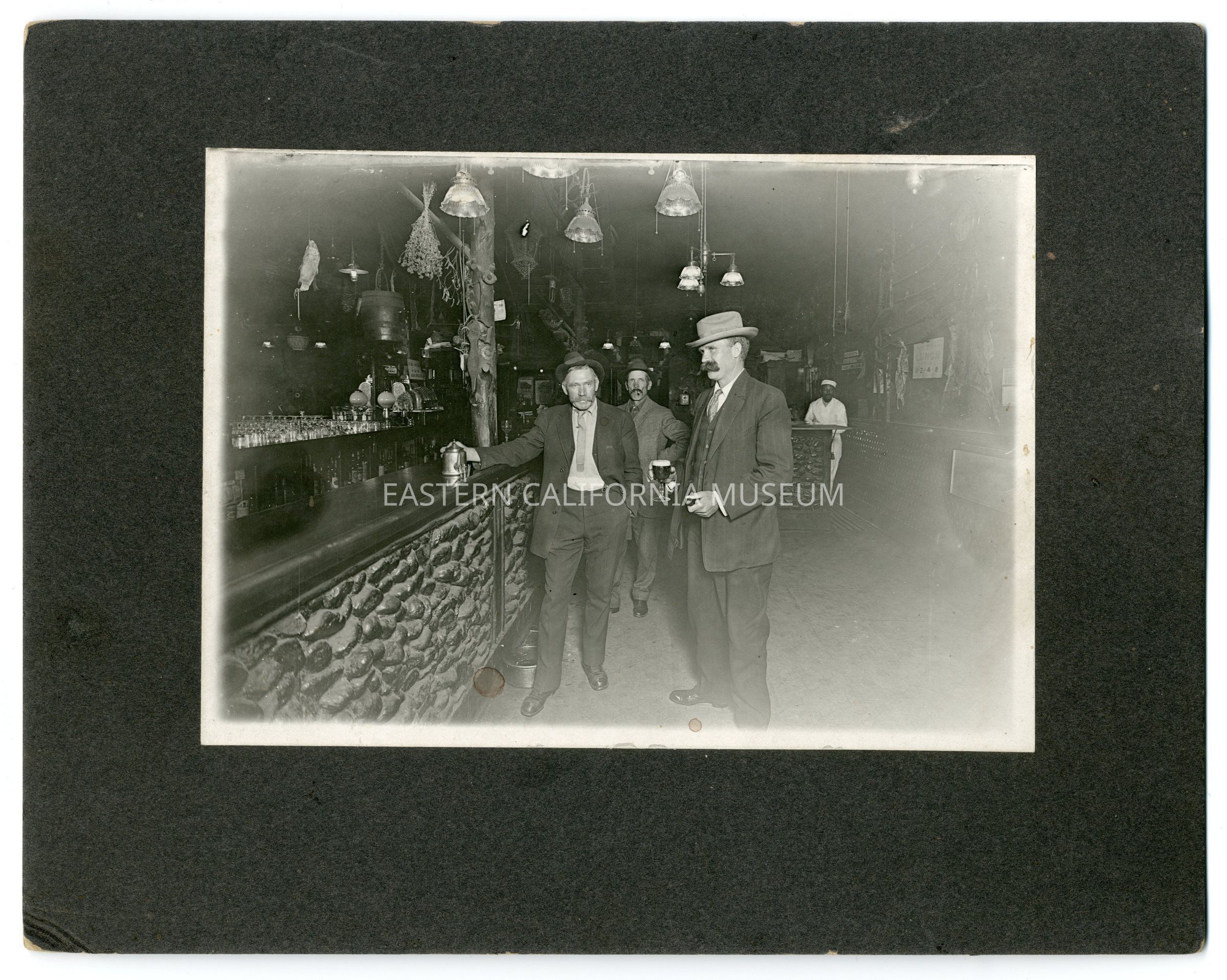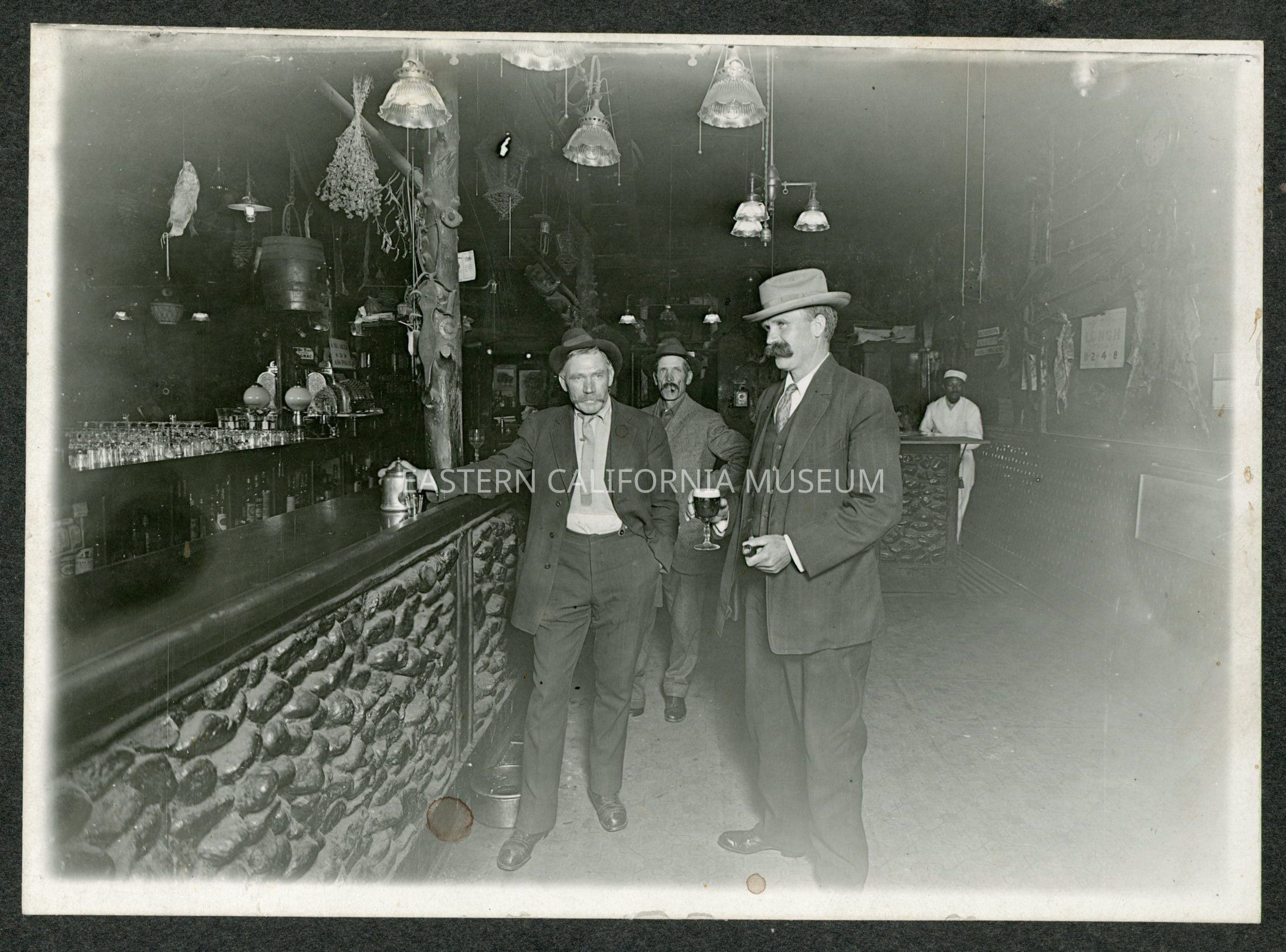 Mounted photo of the interior of a saloon or bar. There are three men in the foreground and one African-American man in the background wearing a white server's uniform.