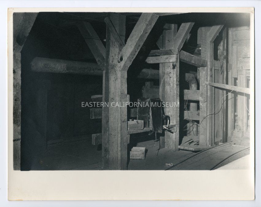 Photo of a mine interior: timbers, cart tracks, and pipe.