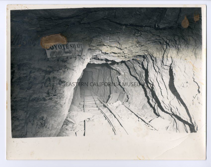 Photo of a mine interior. Sign says: "Coyote Shaft." Spots of damage to face of photo.