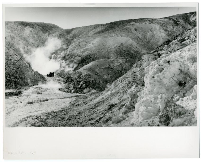 Black and white print of a vehicle in a canyon. Likely Coso Hot Springs region. On reverse: "4466"