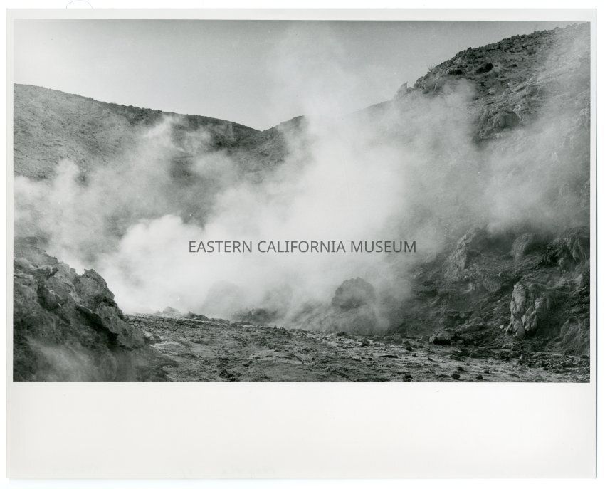 Black and white print of steam rising from the ground in a rocky, hilly location. Likely Coso Hot Springs region. On reverse: "4461"